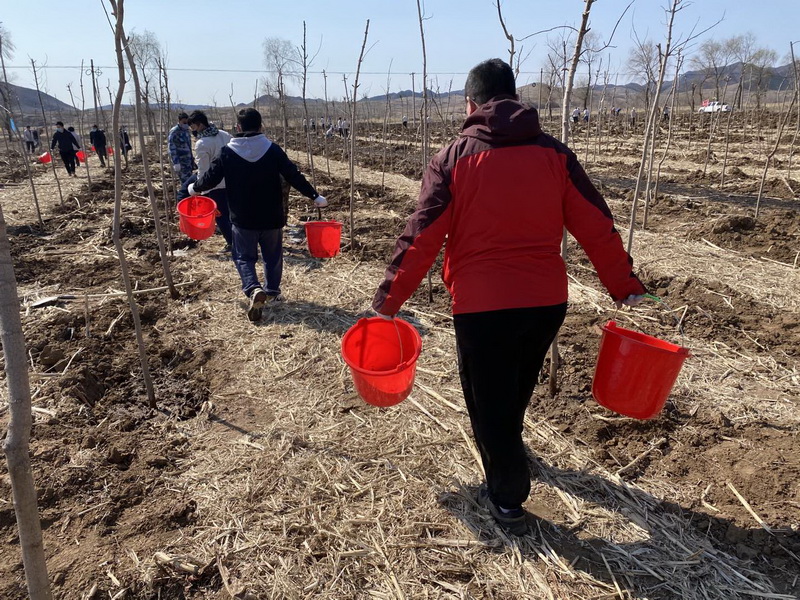 活動現場,黨員們手持鐵鍬,個個熱情高漲、干勁沖天。大家相互配合,挖坑、放苗、培土、澆水,共同栽種了京桃、糖槭樹樹苗2000余株。