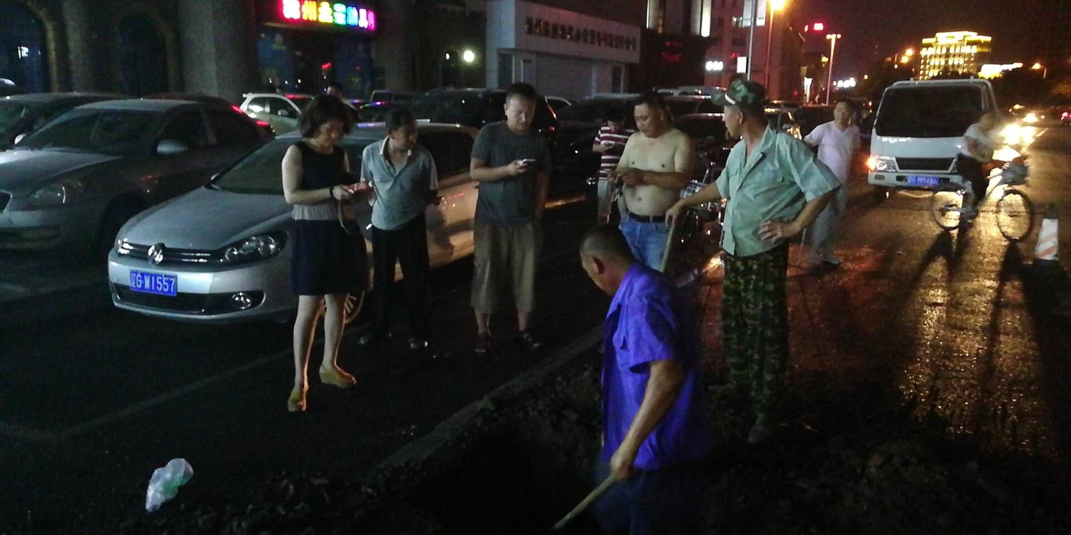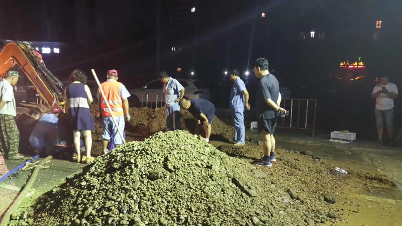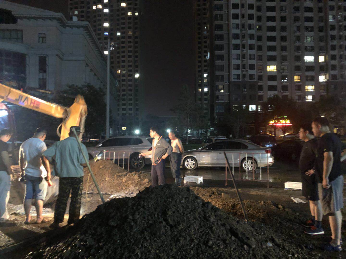 晚上七點,太和經營管理公司領導來到現場指揮搶修工作,經排查發現該漏水管線是寶地公司私自預留過道管線,太和公司管網圖紙上沒有該管線情況,這段未知的“盲腸管”管線增加了維修難點,通過多年維修經驗判斷是二次網主管線PE160管線暴裂,需要關閉中高區閥門停水作業搶修。由于曼哈頓A、B1、B2、C、D、G區共用一個泵房,會導致曼哈頓小區7層以上用戶暫時停水。高溫天氣大范圍停水會給用戶帶來不便,太和公司領導及維修人員分外著急,立即向上級領導請示并申請停水作業。21點50分,集團公司董事長、總經理周立軍來到曼哈頓搶修作業點與搶修工人共同奮戰,在得知搶修作業面臨的諸多困難后,為能盡快完成搶修作業,以最快速度給用戶恢復供水,周董事長立即致電管網公司,讓其加派人員和設備配合太和公司一起作業。