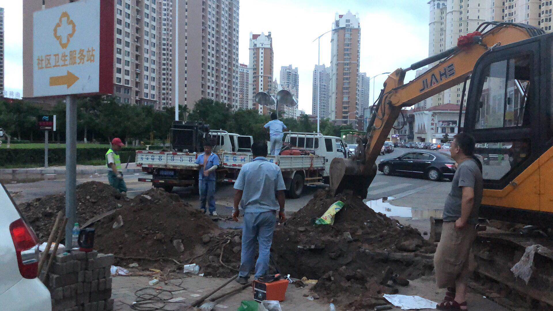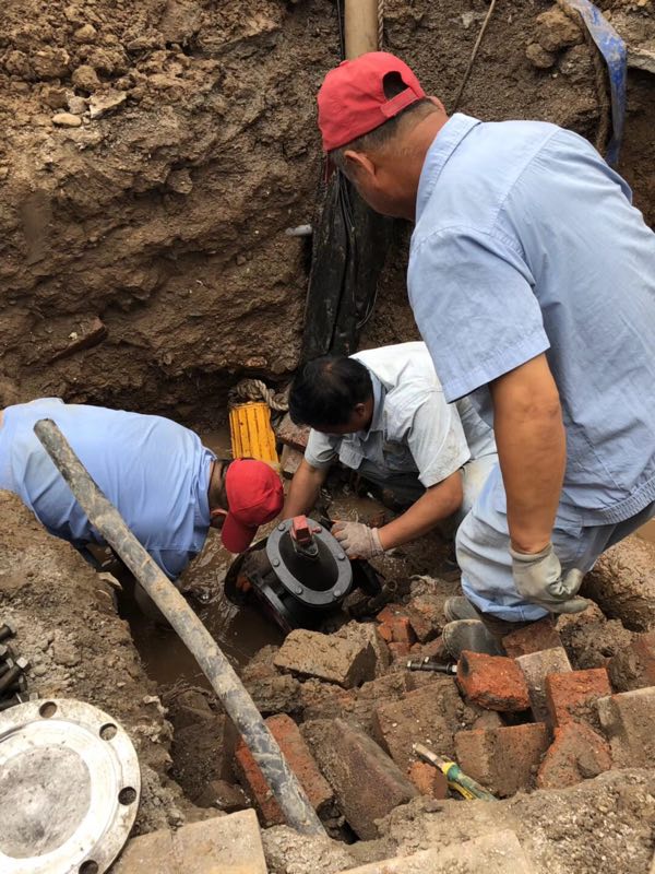 為縮短停水時間,集團公司制定了最佳搶修方案,晚20點30分鉤機、高架燈、發電機組、排污泵等搶修設備陸續進場作業,組織開挖,發現漏點后,維修人員全力以赴搶修漏水管線。這期間,周董以及太和公司領導電話一直占線,處理用戶咨詢及投訴電話,并及時向應急中心匯報搶修進度。8月5日凌晨5點,漏點修復完畢,但隨即維修人員又發現了新的漏點......據悉,該小區在施工建設之初,路面東側應有六根管線,即:三根開發預留給曼哈頓E區供水管線和三根消防管線,后因曼哈頓E區又設立單獨泵房此管線就荒廢在此。夏日高溫,維修人員早已汗流浹背,但他們本著“搶修快一點 通水早一秒”的執念,甩開膀子,擼起袖子,又前往下一個作業點作業......PE250、PE160和PE100管線找到漏點,集團領導一切都以居民利益為主,為今后出現爆管情況能夠縮小停水范圍,當即在此管線加了兩個閥門。悶熱的天氣,近20名搶修工人連續奮戰近20小時,終于在8月5日中午11點30分完成搶修作業,開閥供水。下午13:00,曼哈頓小區中高層用戶全部恢復正常用水。此次搶修任務得到了曼哈頓小區用戶的一致好評,每一個好評背后都凝聚著水務維修工人的辛勤汗水。
