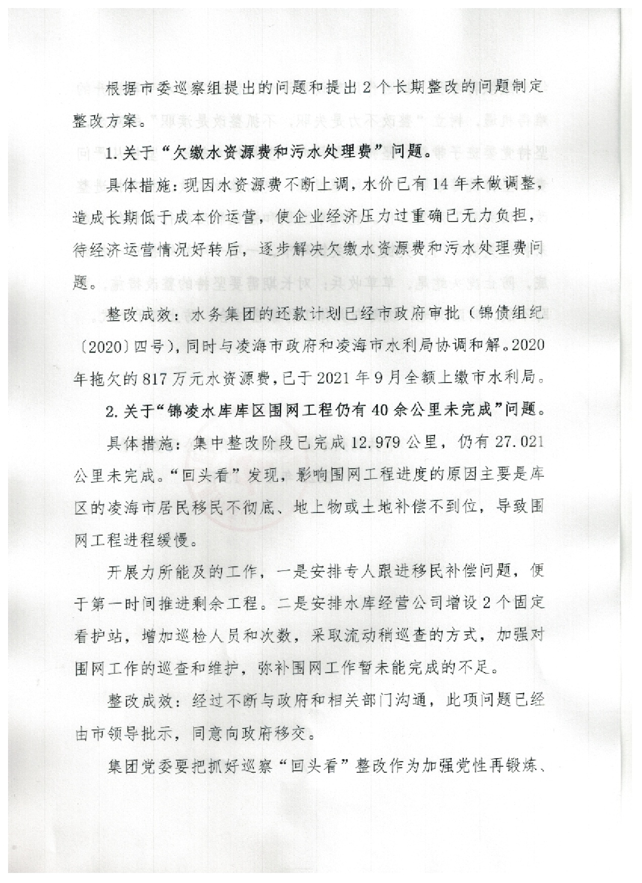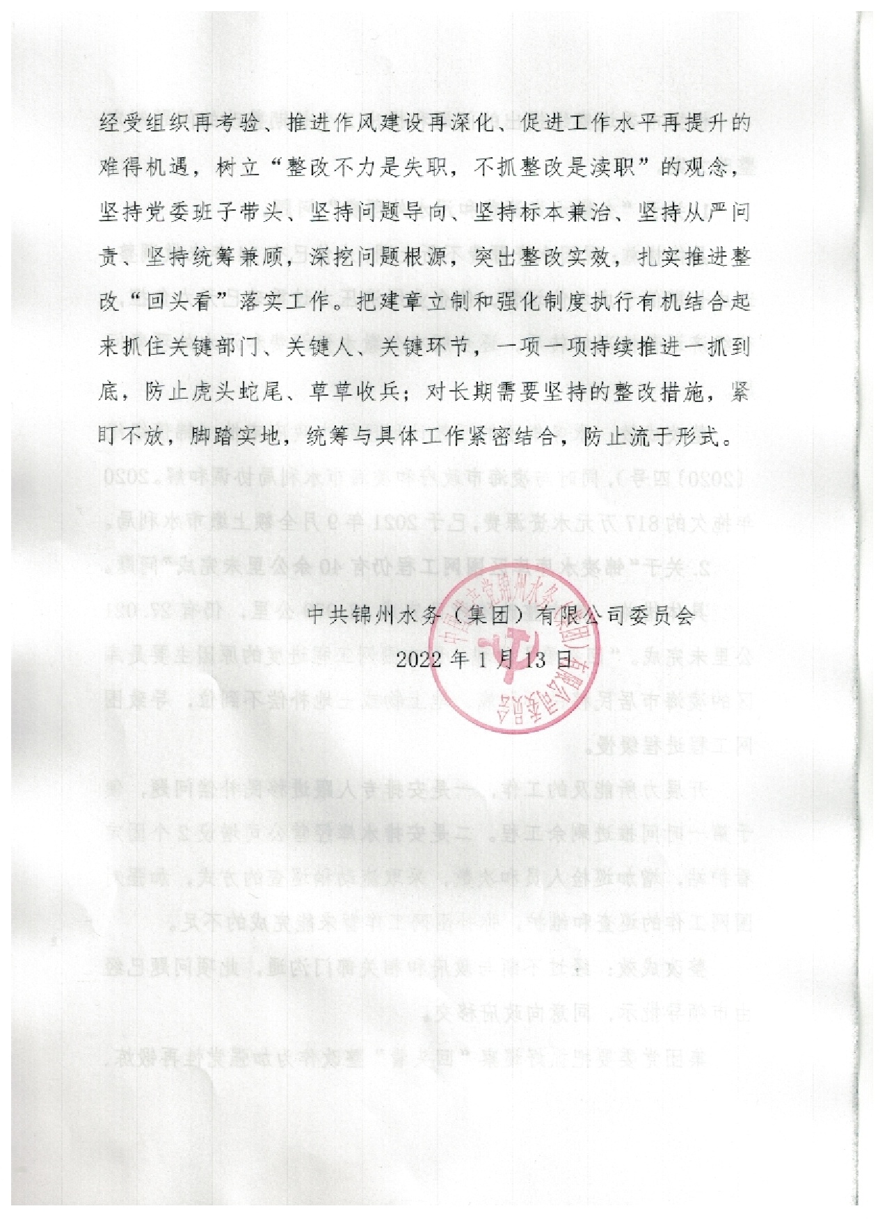 錦州水務(wù)(集團)有限公司黨委關(guān)于市委第一巡查組巡察整改落實“回頭看”整改情況