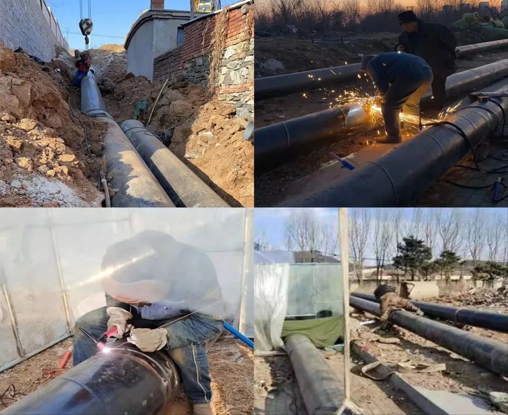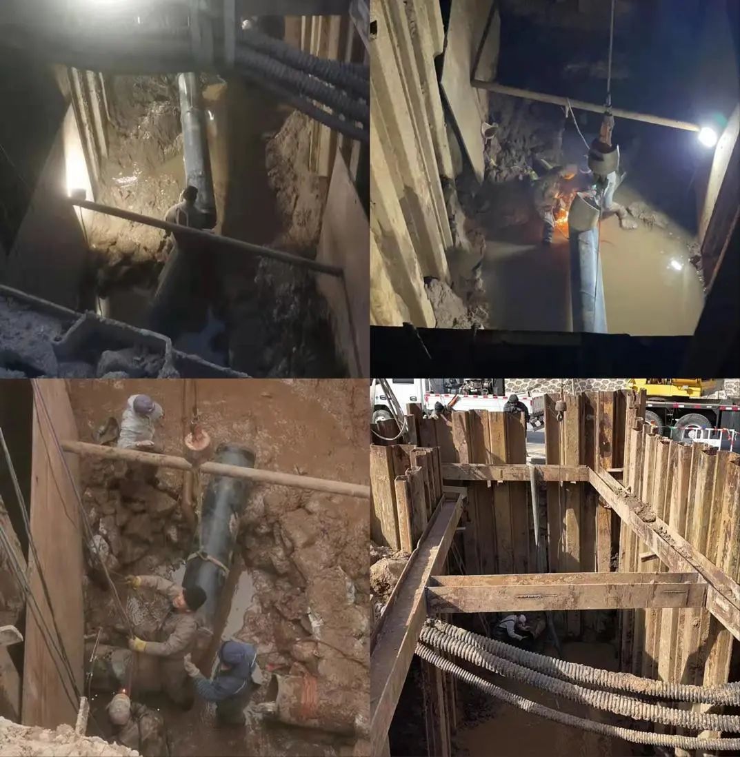 整個施工過程中,沒有一名施工人員喊苦叫累,不管是突發任務的夜里,還是晨曦微露的黎明,大家都咬緊牙,堅持突破施工的一個又一個難點。跨越百股河、濱河路及濱河路防洪護坡礫石和巖石層,或者開鑿1米厚凍層直埋鋪設鋼制管線,都不是最難的。其中最難的一個作業點位置在百股河東岸,由于路政排水管線、大唐熱力管線及電纜管線埋深較深,所以管線需埋深在6米左右,那么溝槽開挖深度必須在7米左右,打樁9米,深開挖基坑作業本身存在一些難度,技術要求非常高,但更困難的是在施工作業點處還需要跨越華潤DN1000中水管線、濱河路DN1600主排水、大唐DN700中水管線、防疫二通道DN1000雨排和多條1萬伏高壓電纜等多條地下主管道。還有兩座萬伏電纜井及高壓電纜管線都在此基坑中。由于地處河道管線開挖至4米深處就已經出現了地下水,施工人員首先將地下水排出去,采用打樁和鋼板支撐等施工工藝,確保施工人員人身安全,避免塌方。由于坑內出現大量淤泥,坑內管線復雜,無法使用機械開挖,全部人工清淤,為了防止河水回流,大家連夜施工,施工人員凌晨穿著皮衩站在淤泥中一鍬一鍬地將淤泥挖出來,將新舊管焊接完成。