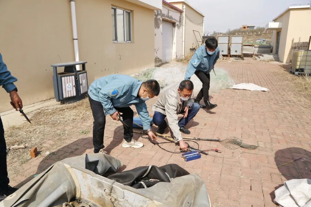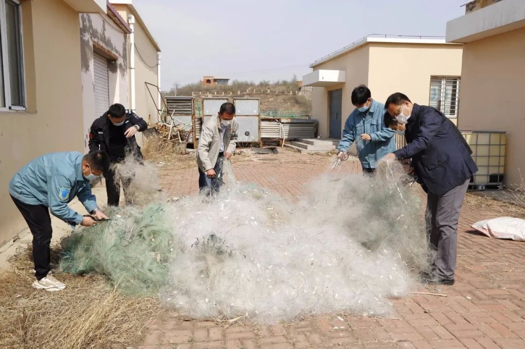 “銷毀!”隨著一聲令下,共計167斤,總長度達5000余米的違法網具,電魚器兩套、船只兩艘,錨桿若干,總估值超萬元的違法捕魚工具通過非焚燒的環保方式全部銷毀,并統一填埋。