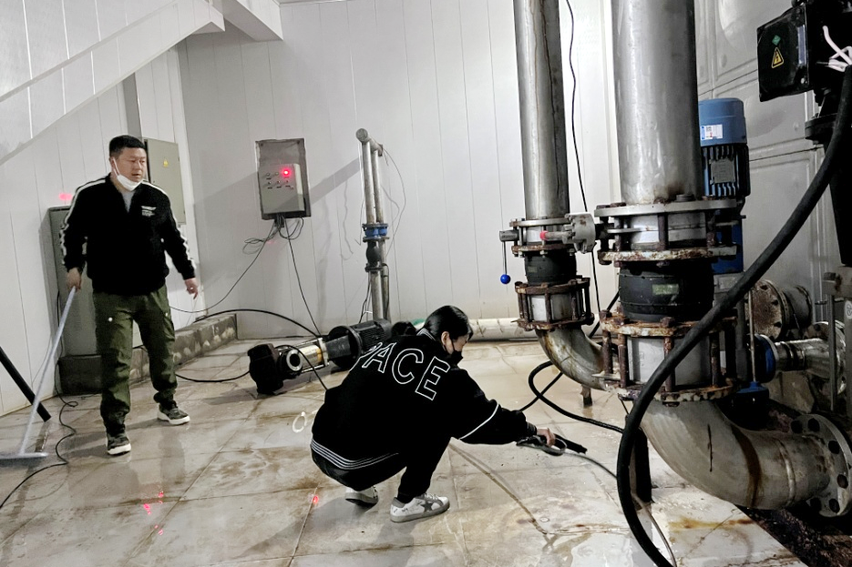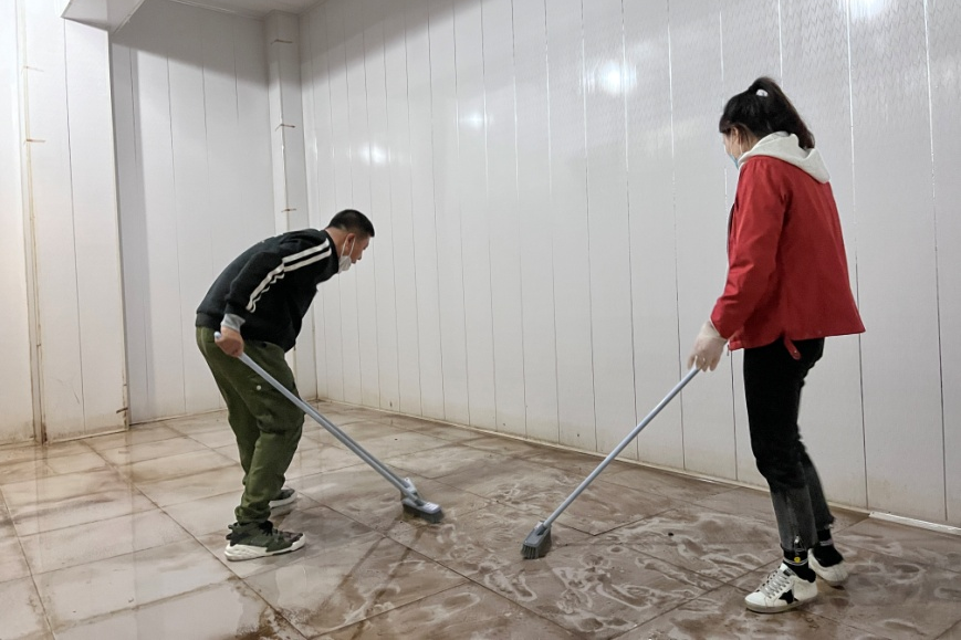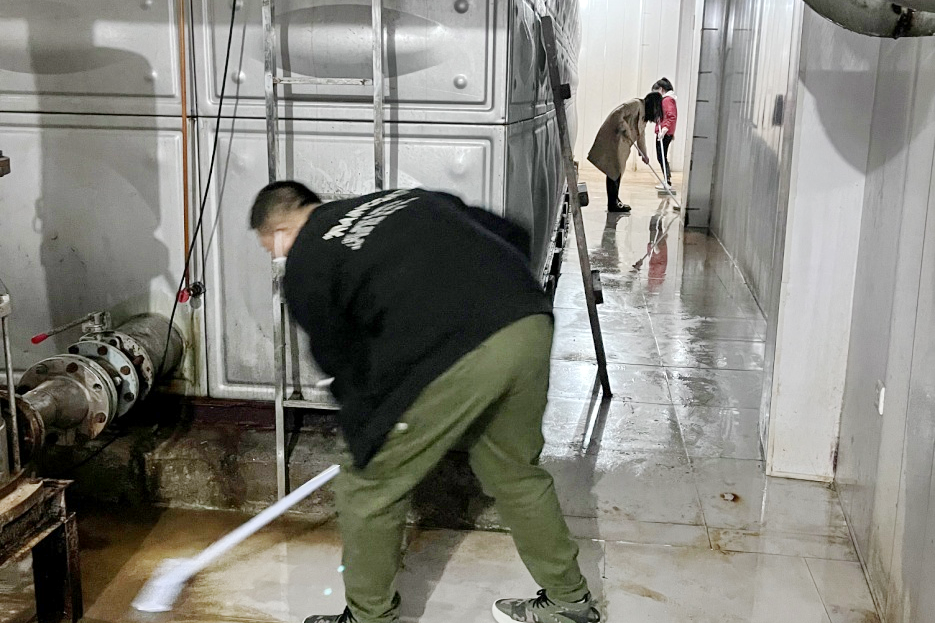 由于南站風情小鎮泵站為地下式泵房,環境潮濕地面易形成污垢,清理較困難。大家分工協作,用水槍沖洗地面、用燒堿去除地面污漬、用長柄鋼刷刷洗地面、用拖布拖干,泵房煥然一新。隨后,職工們還對工作場所進行了細致消殺,保證了泵站安全衛生。