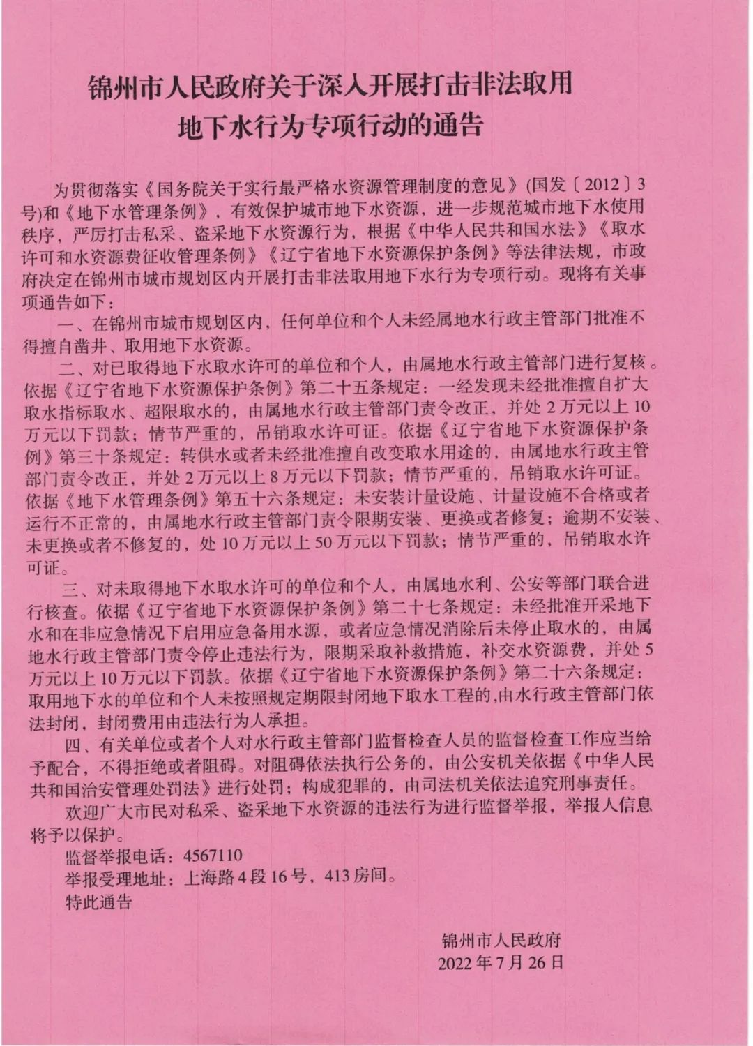 7月28日,市政府下發了《錦州市人民政府關于深入開展打擊非法取用地下水專項行動的通告》《錦州市深入開展打擊非法取用地下水行為專項行動工作方案》。公司作為政府指定配合聯合執法檢查的重要職能單位,接到通知后,公司黨委書記、董事長劉杰熙,黨委副書記、總經理安慶武第一時間作出指示,責成相關單位組建專業隊伍,并制定了《錦州水興實業有限公司配合市執法部門聯合打擊非法取用地下水行為專項行動工作方案》。