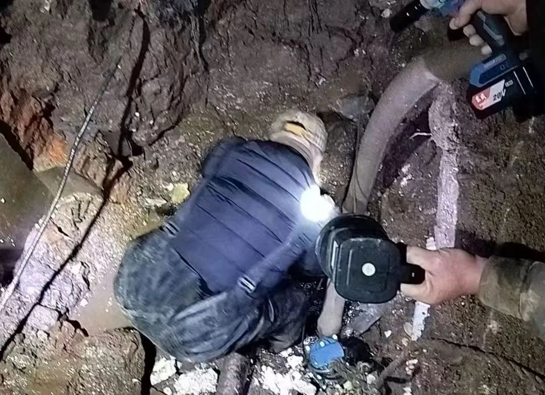 20:10,星匯園小區(qū)23號樓下漏點(diǎn)被確認(rèn)為DN100鑄鐵管管線直管段開裂,搶修人員隨即開始修復(fù)工作。