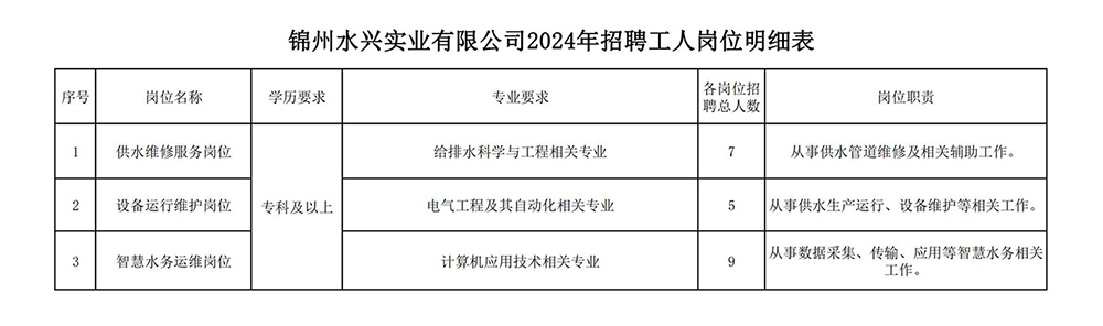 招聘信息將通過錦州市人才網、錦州市國資委網站、錦州水興實業有限公司官網發布。(不少于5個工作日)